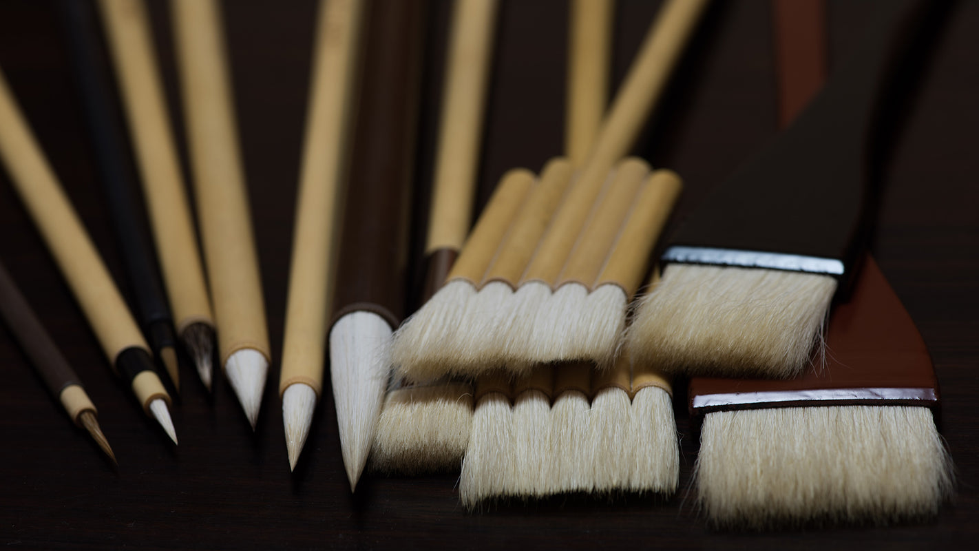 極細の面相筆から大型の絵刷毛まで、多品種の筆・刷毛を職人が工房内で1本1本製作し、初心者からプロの方まで幅広くご愛用頂いています。